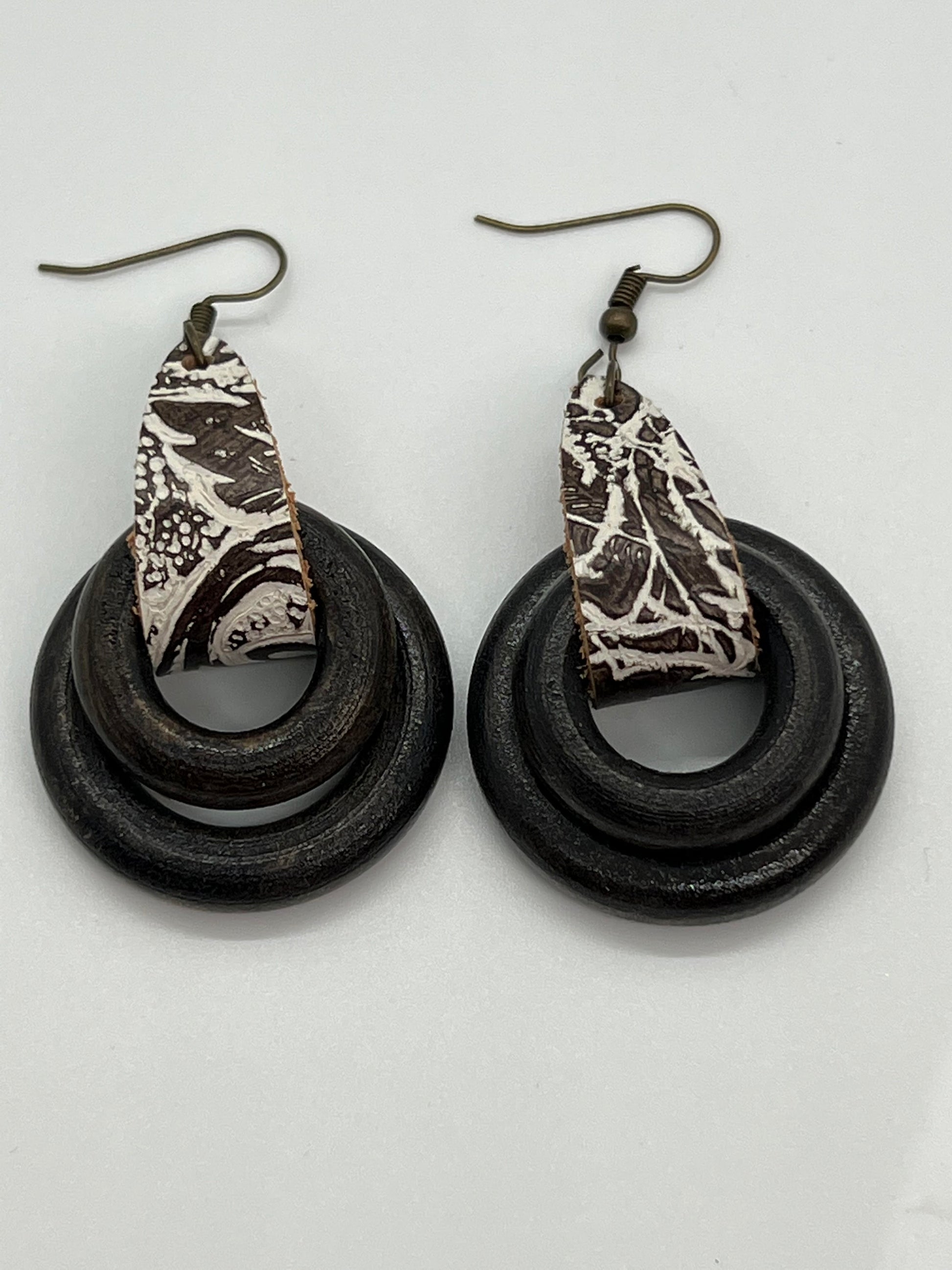 These leather earrings are in a western floral pattern in cream and brown and are mounted to a medium & small stained wooden ring. I have mounted them to an antique gold fish hook and they have an approx. drop of 2-3/4".