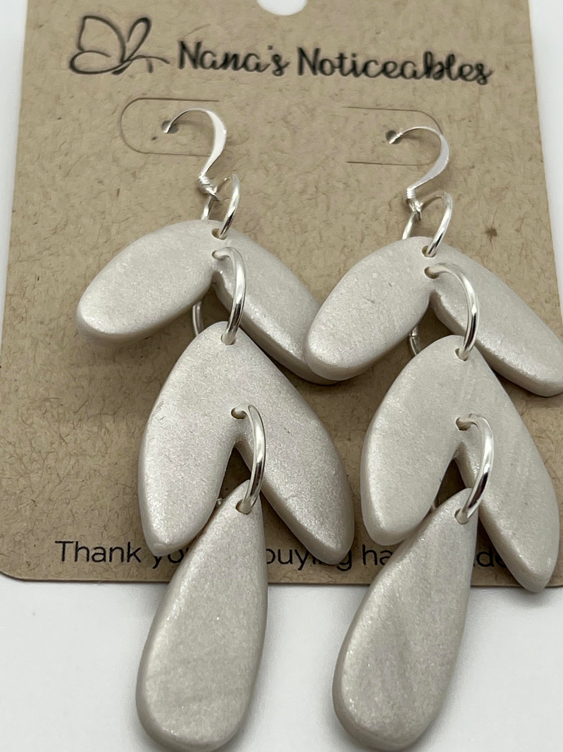 Polymer 3 tier drop in either black sparkle or pearl white. Mounted on a fish hook with an approx. drop of 3-1/2".