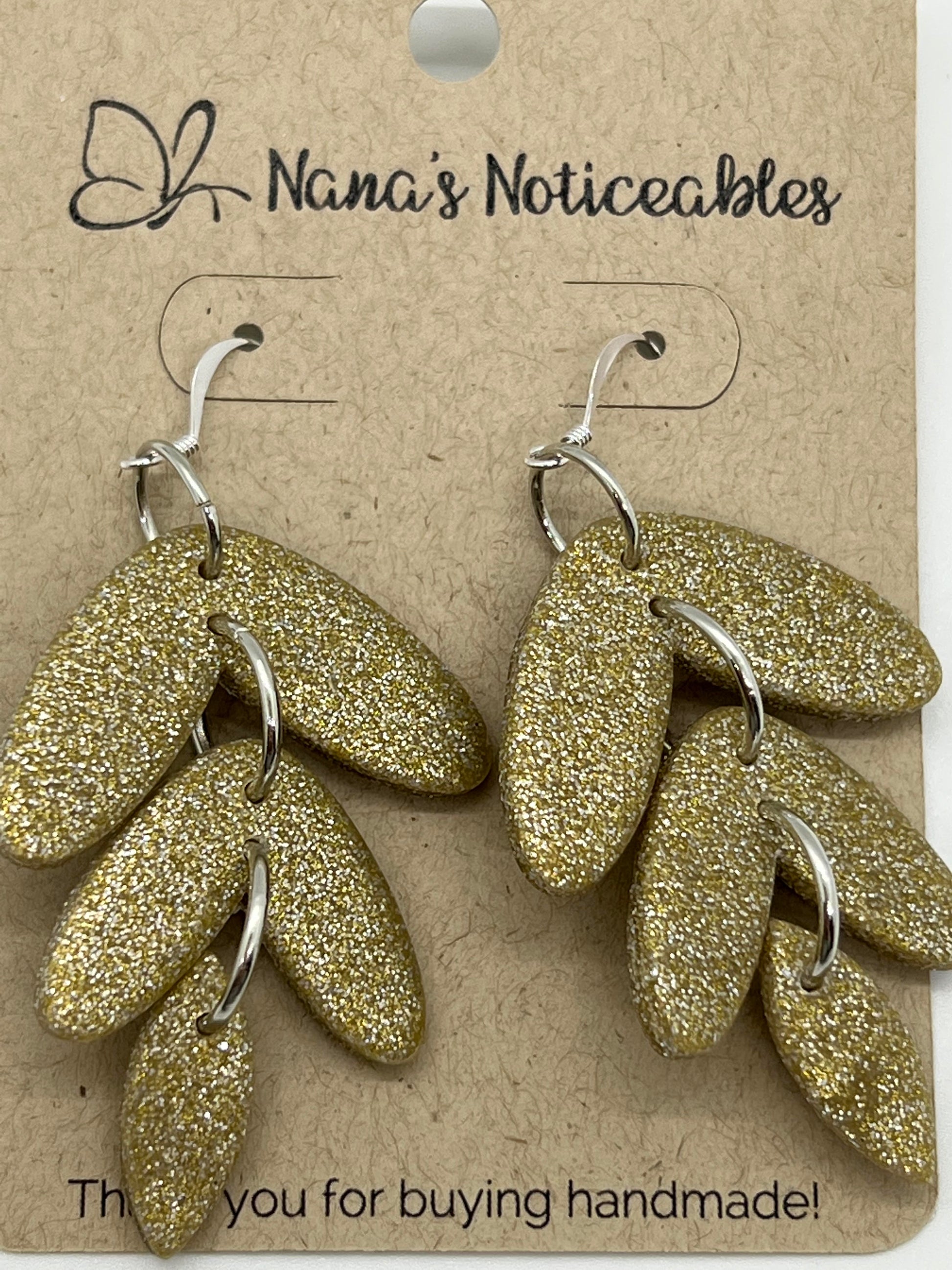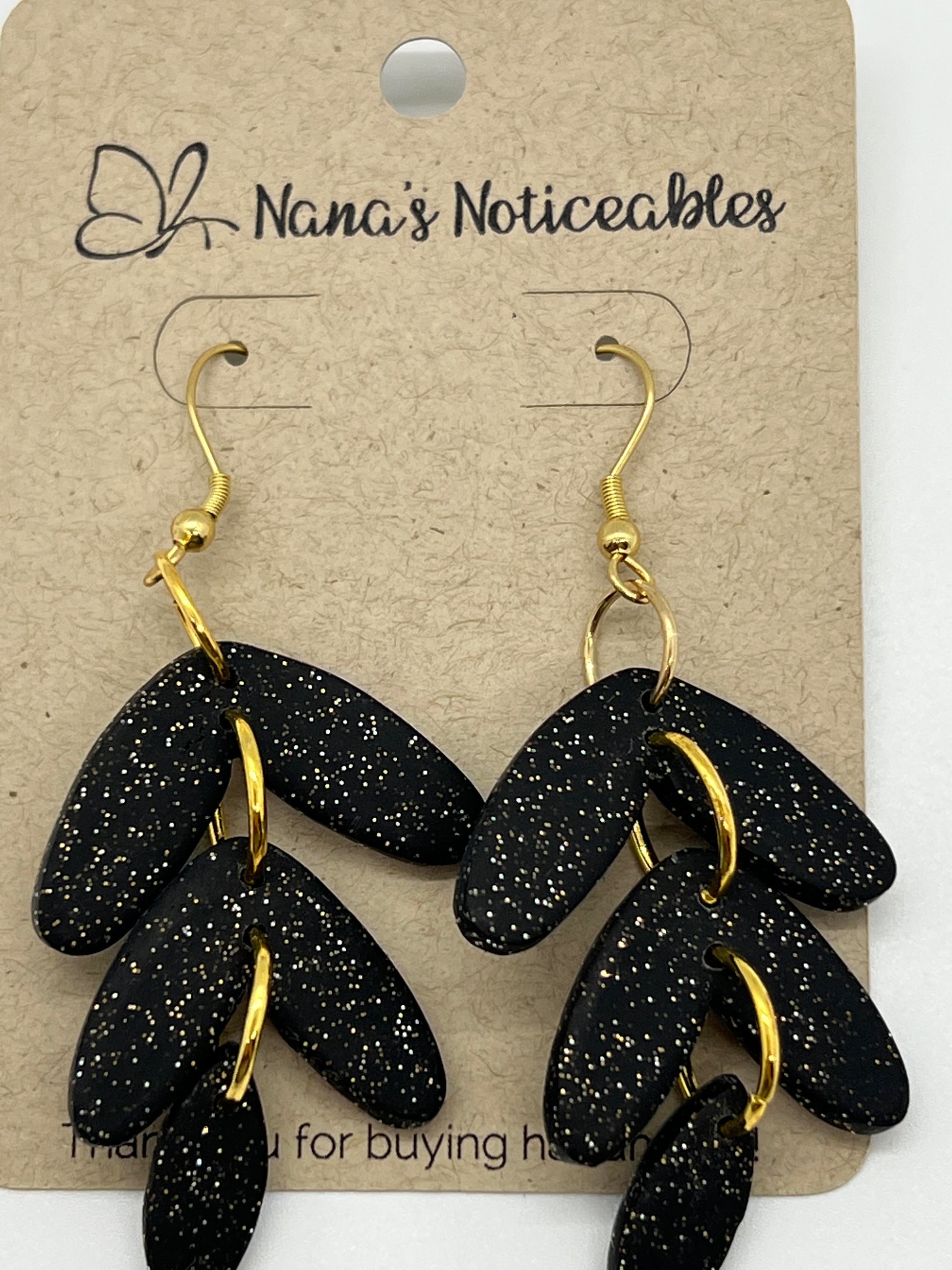 Polymer 3 tier small drop in options of sparkle black, silver, gold or rose gold. Mounted on a fish hook with an approx. drop of 2-1/2".
