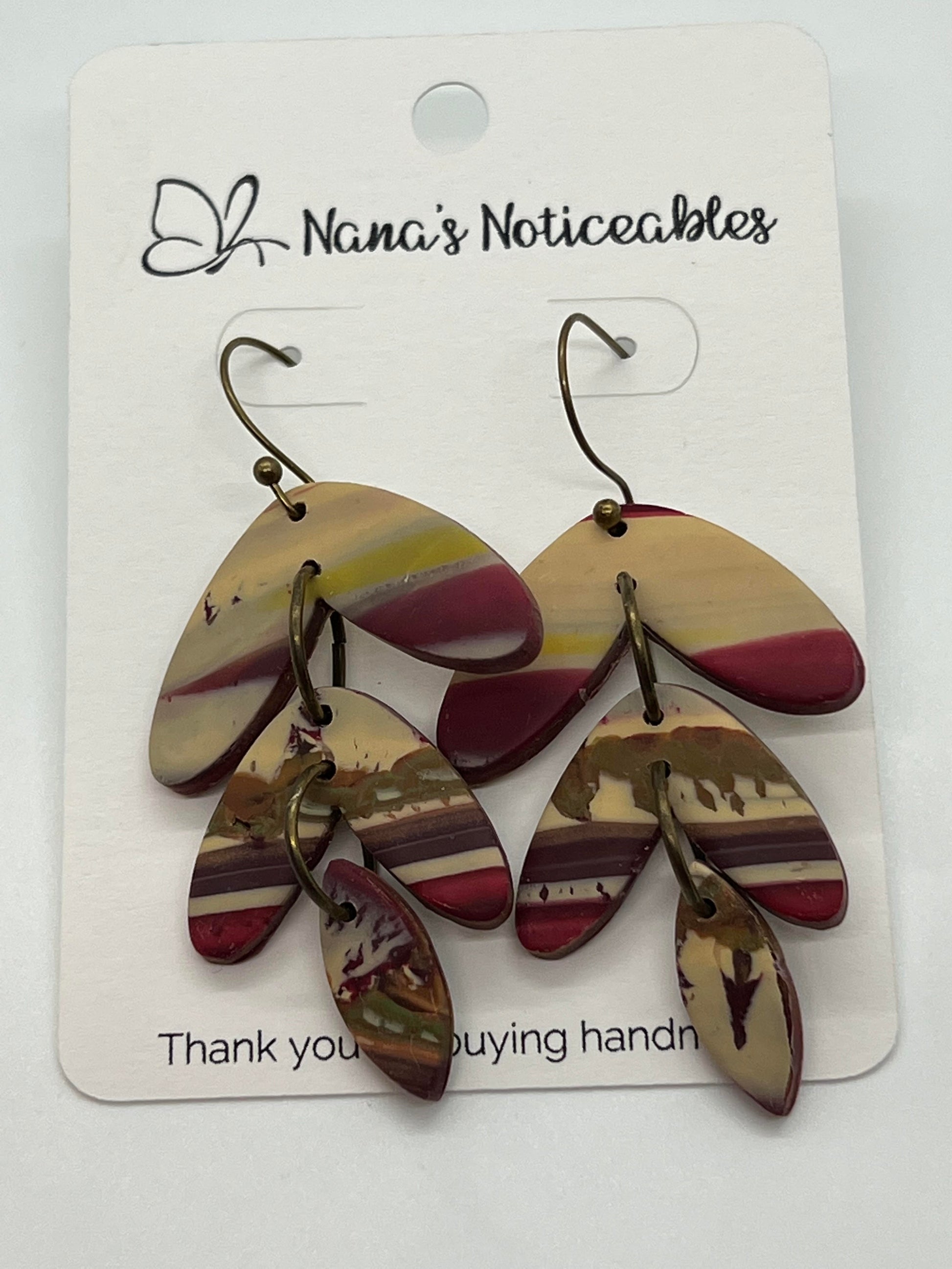 These polymer earrings have all your fall colors in these drops. They are mounted on an antique gold fish hook and have an approx. drop of 2-1/2".