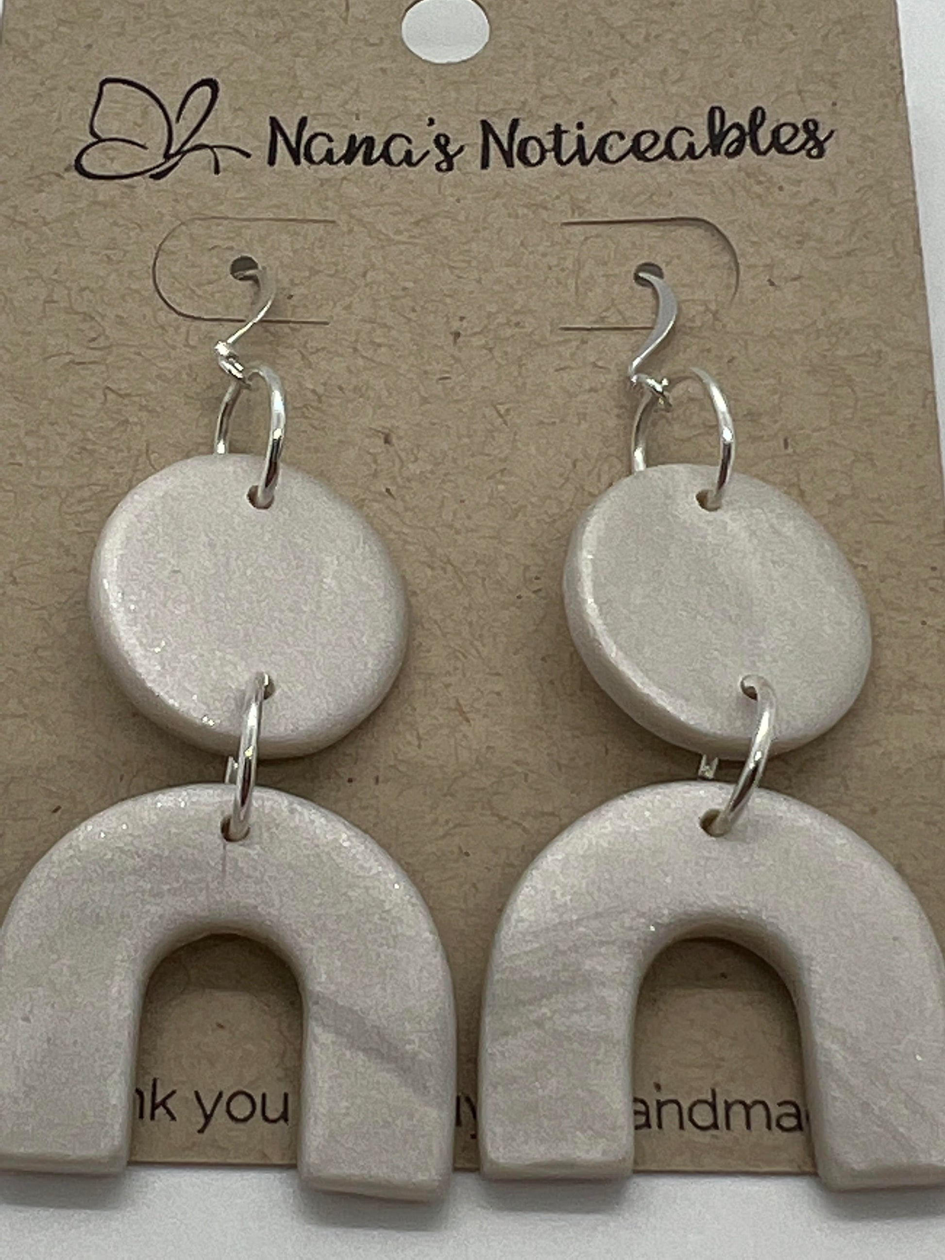 Polymer large circle and rainbow in pearl white. Mounted on a fish hook with an approx. drop of 2-1/2".