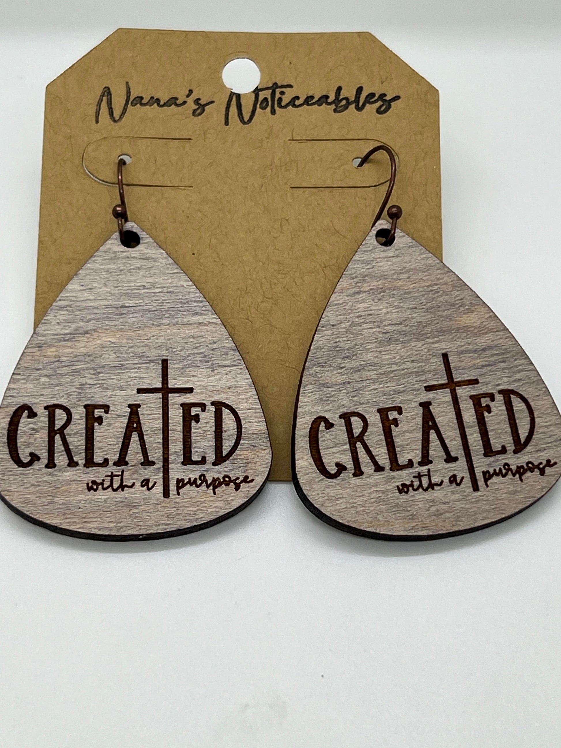 Wood stained drop "Created with a purpose". Approx. drop is 2-1/2".