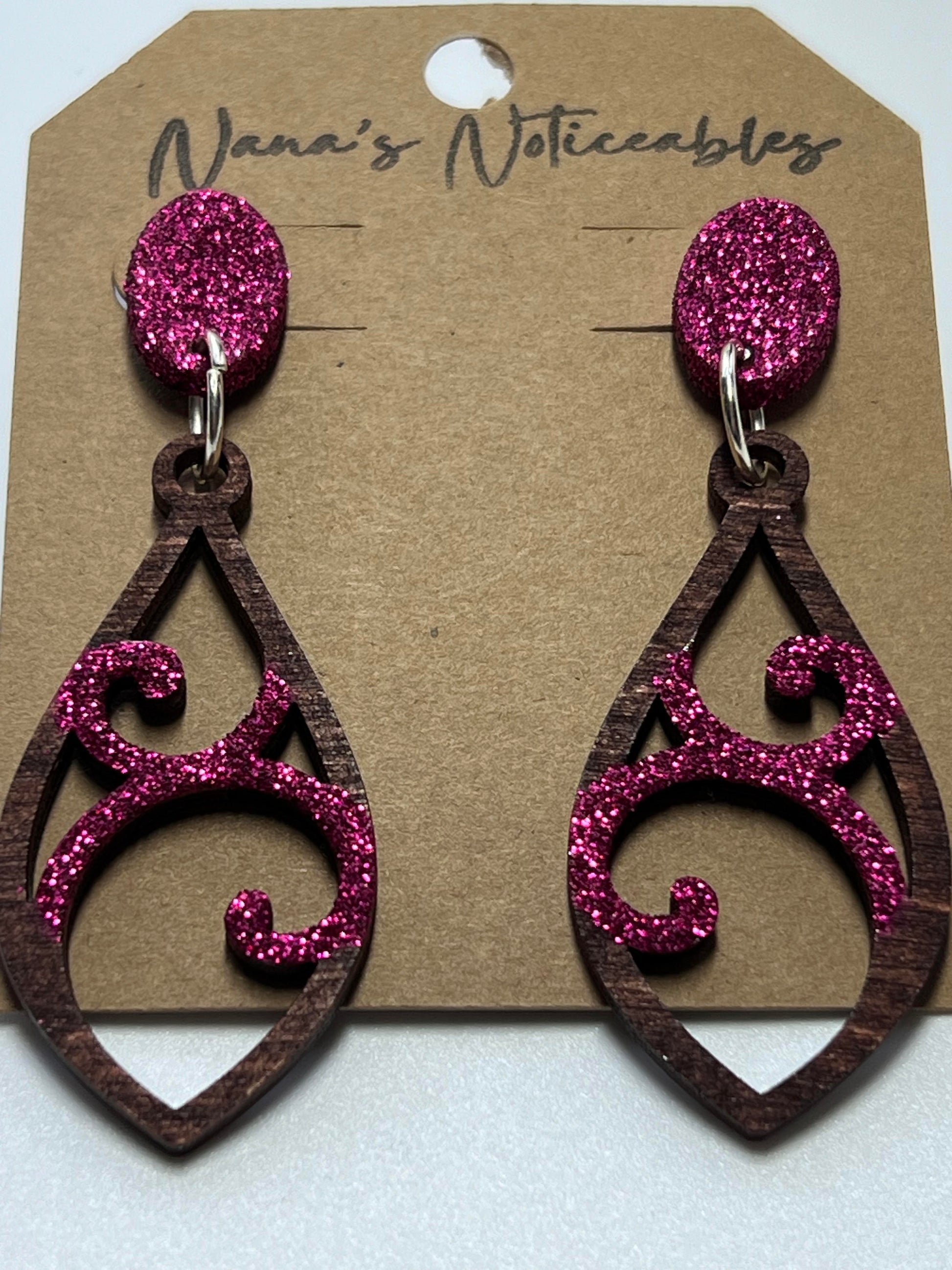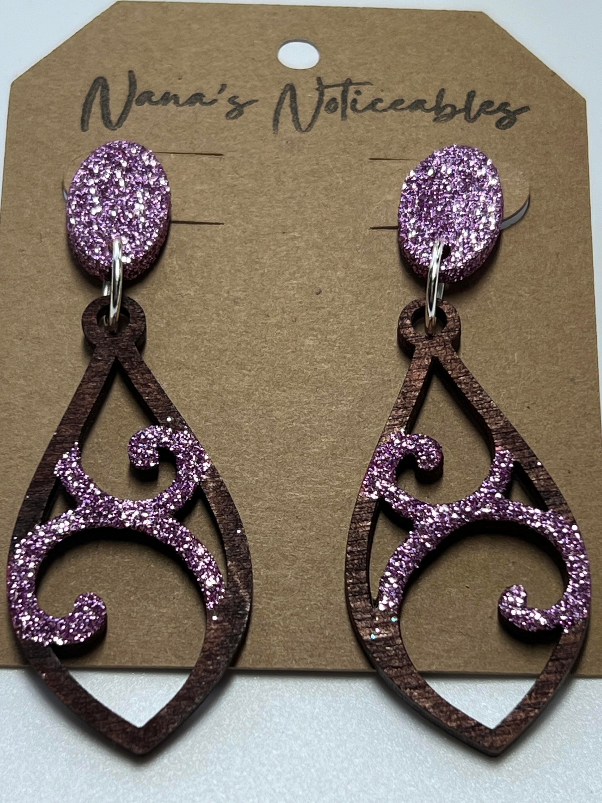 Wood stained & glitter drop scroll. Approx. drop is 2-1/2".
